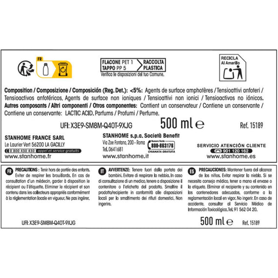 Prima dell'uso, sostituire il tappo con il nebulizzatore Stanhome per ottenere un flacone spray. Girare la rotella del nebulizzatore in posizione ON. Spruzzare il prodotto a più di 20 cm dalla superficie da pulire. Lasciare agire per un minuto. Risciacquare. Asciugare nel caso di superfici cromate scintillanti. Dopo l'uso, riposizionare la rotella del nebulizzatore in posizione OFF.