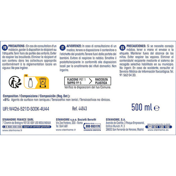 I nostri impegni : La sua formula, senza profumi aggiunti, è composta dal 92% di ingredienti di origine naturale. È facilmente biodegradabile* nella parte organica. Stainless Clean ha ottenuto la certificazione Air Label Score con una valutazione A+ che garantisce un prodotto sicuro per l'aria interna e rispetta la tua salute. L’imballaggio è interamente riciclabile e il flacone è composto al 100% da plastica riciclata. Ricordati di riutilizzare il nebulizzatore (fino a 10 volte) per ridurre i rifiuti plastici.